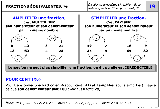 | MEMENTO : FICHES DE MATHS * Ce petit dictionnaire mathématique contient 76 fiches aide-mémoire. Chaque fiche peut être complétée par l'élève, par le maître, par les parents ... * C'est une sorte de "prothèse" mathématique pour les élèves; ils peuvent s'appuyer sur ces 76 fiches-mémo et vivre les apprentissages sans se soucier d'apprendre les formules par choeur par exemple; le "par choeur" vient plus tard, au moment où les outils ont du sens. (voir une fiche) * Un index thématique (76 entrées) (Voir un extrait de l'index) * Un index alphabétique: plus de 450 entrées qui permettent de retrouver facilement les notions, des formules, des éléments "basiques". (Voir un extrait de l'index) * Des références au bas de chaque fiche qui permettent de renvoyer l'élève vers d'autres sources; dans le document de base, il s'agit des moyens officiels des écoles secondaires de Suisse romande. * Les ouvrages peuvent être commandés sur http://www.editionslep.ch/ , rubrique mathématique.